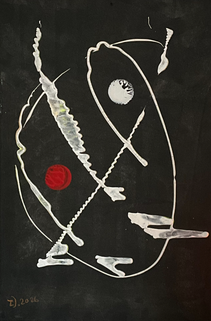 This digital poster translates the raw energy of gestural abstraction into a refined graphic surface. The dense lattice of white markings vibrates across a deep black ground, creating the impression of written language dissolving into pure rhythm. What initially appears chaotic gradually reveals an inner structure — a visual pulse that pulls the viewer into its center and then releases them back into the surrounding field.