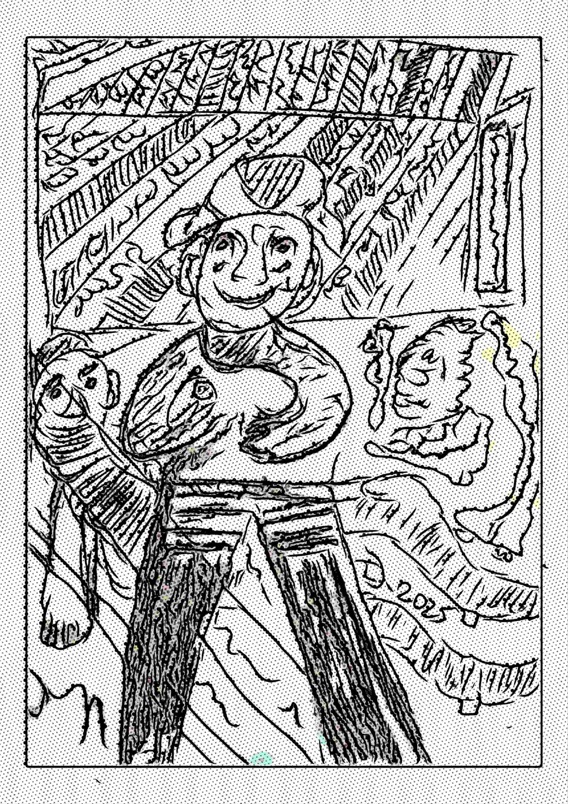Mit „Strichwelten“ entführt LTJ den Betrachter in eine surreale Szenerie, die zwischen kindlicher Naivität und dadaistischem Chaos oszilliert. Im Mittelpunkt steht eine fröhlich wirkende Figur – breites Lächeln, große Augen, eine Kappe auf dem Kopf – fast wie ein Cartoonheld aus einer vergessenen Ära. Doch der Kontext ist alles andere als harmlos: Das Dach scheint sich zu neigen, Linien laufen quer, Worte oder Zeichen durchkreuzen das Bild wie kryptische Gedanken oder akustische Störungen.