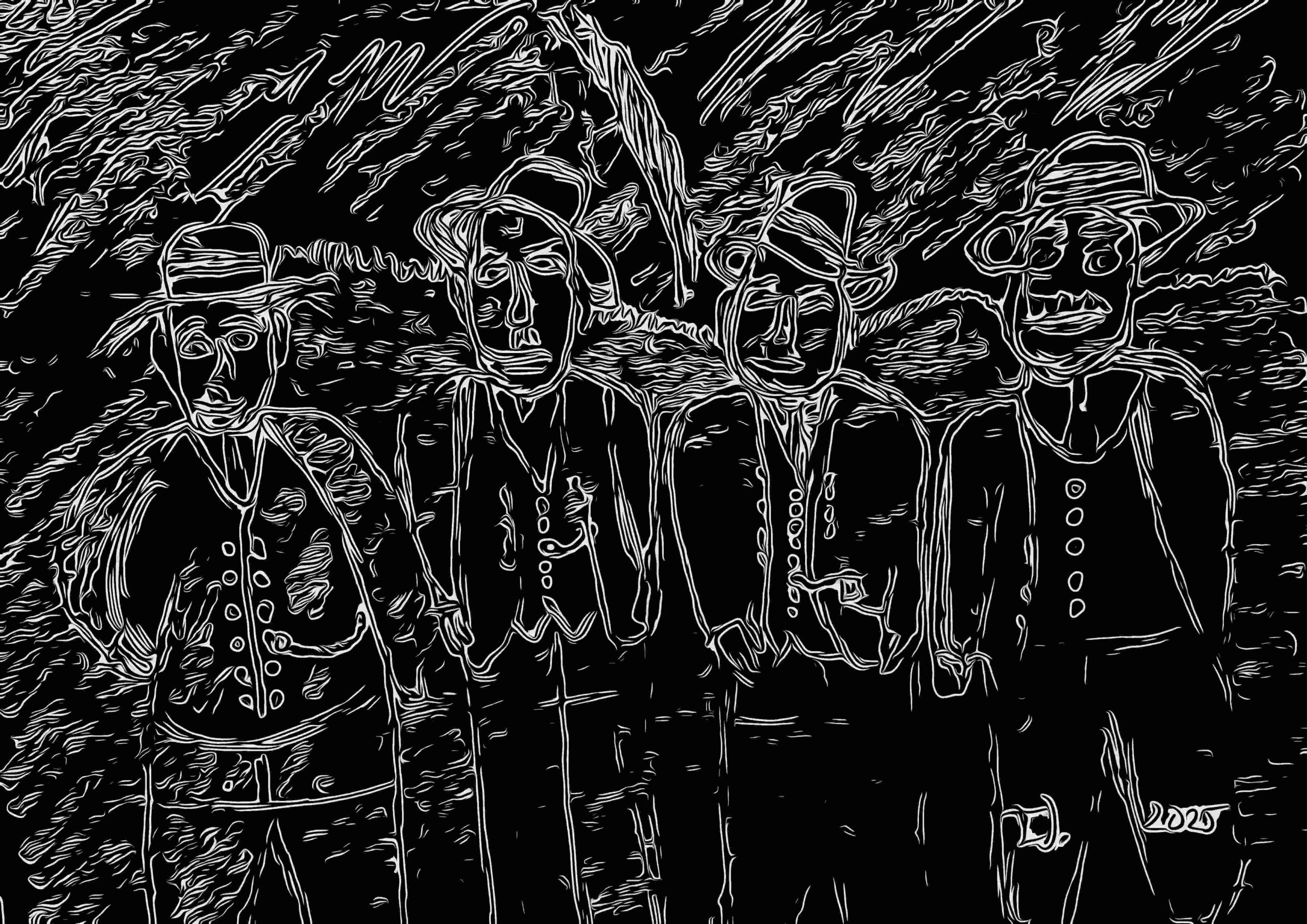 In diesem Werk von LTJ blicken uns vier Männer aus einer anderen Zeit entgegen – stehend, fast starr, wie eingefroren in einem Moment, der nie vergeht. Ihre Kleidung erinnert an das frühe 20. Jahrhundert: Westen, Uhrenketten, Hüte, alles fein säuberlich gezeichnet und doch mit einer fast kindlich rohen Linie umgesetzt.