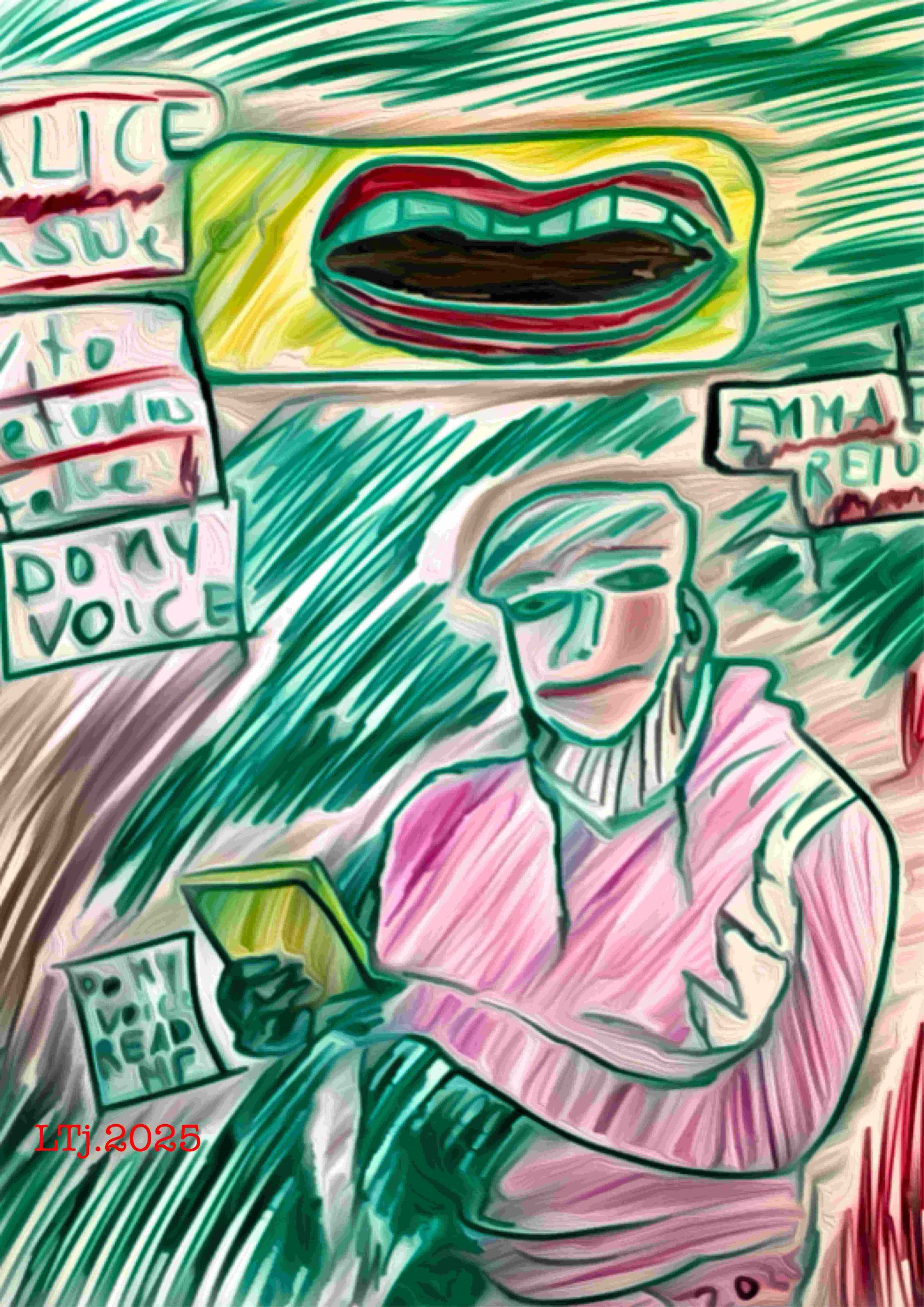 With *“Eiden Wotan – Pixel-God Glitch Yourself Free“*, LTj creates a hybrid portrait that fuses Norse mythology, urban street culture, and digital deconstruction. The central figure stands frontally – almost like an avatar – surrounded by rune symbols, antennas, and a mystical pixel-temple inscribed with: *“Eiden Wotan – Pixel-God – Glitch Yourself Free.”*