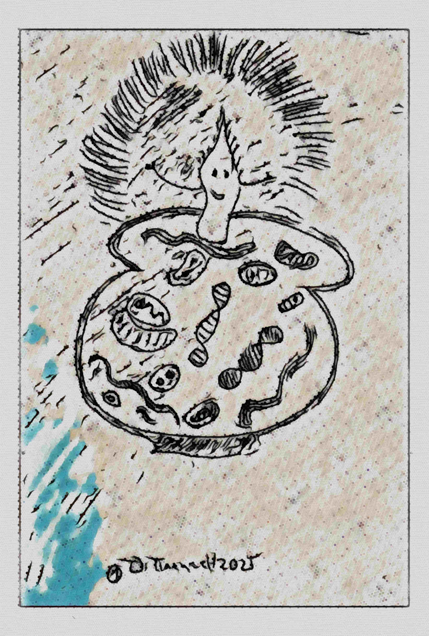 Inmitten einer biologisch-traumhaften Szenerie erscheint eine freundliche Zelle auf einer Palette voller Mikroorganismen. Strahlen aus dem Hintergrund verleihen der Figur fast Heiligenscheincharakter. Ein Bild zwischen Zellbiologie und Poesie – neugierig, offen, lebensfroh. Der Titel „Traumzeit“ passt wie ein Fingerzeig auf eine andere Dimension kindlicher Fantasie.