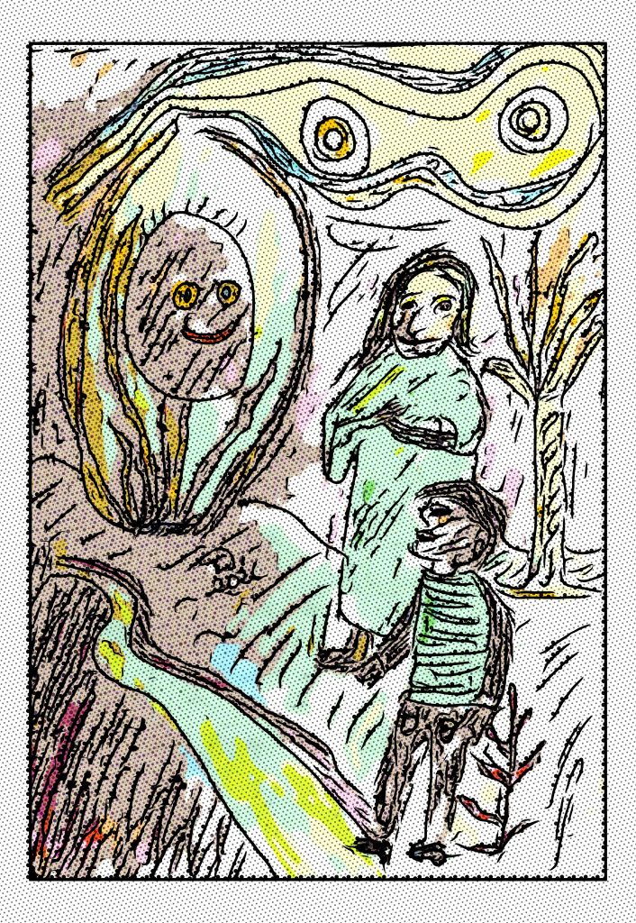 Dieses Werk öffnet sich wie ein Traum, der gleichzeitig freundlich lächelt und im nächsten Moment seltsam flackert. Die Szene wirkt vertraut – eine Figur, ein Kind, ein Weg – und doch ist alles verschoben, gebogen, anders. Die Linien zittern wie Erinnerungen, die gerade erst aus dem Unterbewusstsein auftauchen.