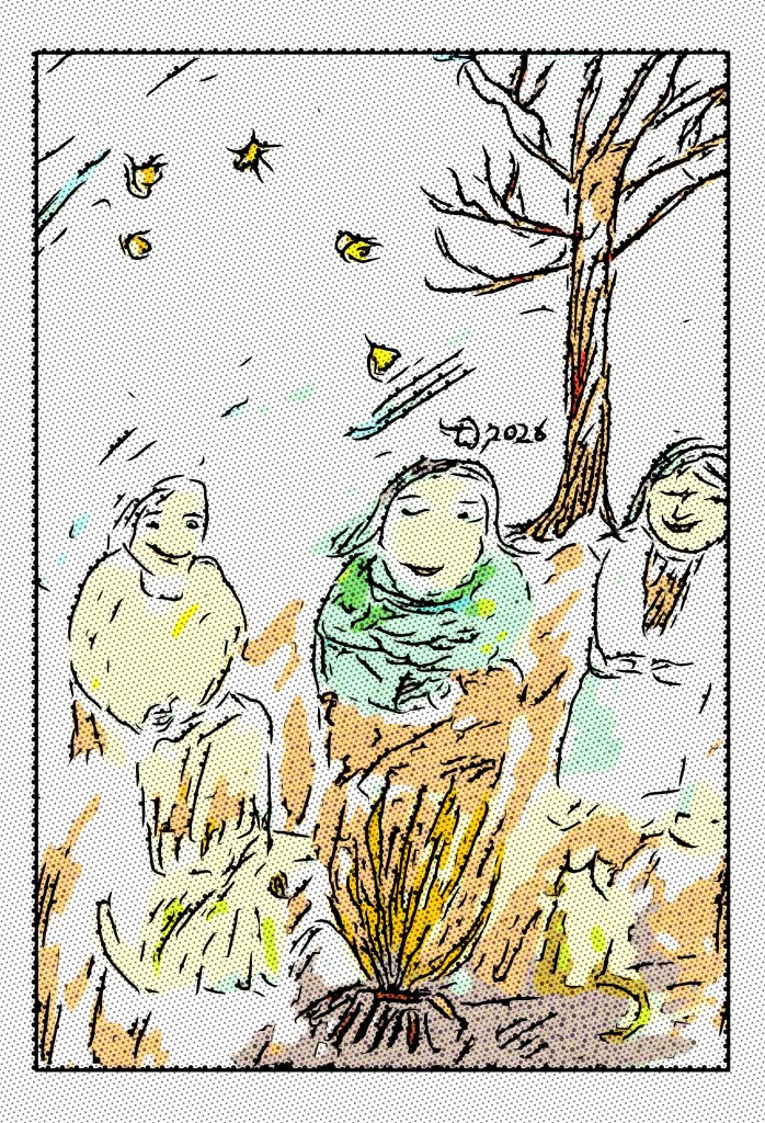 Die Farbpalette – zarte Gelb-, Türkis- und Erdtöne – verbindet die Figuren mit ihrer Umgebung. Das Bild wirkt wie ein stiller Moment in einer wandernden Welt, festgehalten kurz vor dem Aufbruch. Die Jahreszahl 2026 auf dem Gewand ist ein poetischer Hinweis: ein Marker der Zeit, aber auch ein Versprechen für das, was kommt.
