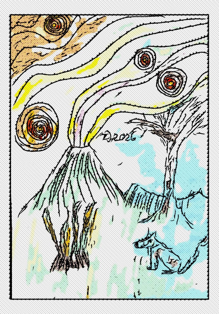 „Hüter der Flammenden Träume – 2026“ ist ein Werk, das sofort durch seine sanft vibrierende Linienführung und die lebendige, fast pulsierende Farbigkeit auffällt. LTJ erschafft hier eine Szene, die wie aus einem wandernden Traumfeld stammt – ein Ort, an dem Landschaft, Figuren und Himmelskörper nicht mehr getrennt existieren, sondern in fließenden Wellen ineinander übergehen.
