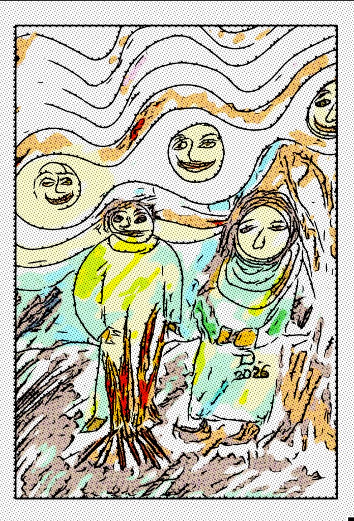 Im Zentrum stehen zwei Gestalten, warm umhüllt von weichen Stoffschichten, die an archaische Nomaden erinnern. Zwischen ihnen lodert ein kleines, symbolisches Feuer – kein zerstörerisches, sondern ein Hüterlicht, ein inneres Glühen, das Erinnerung, Hoffnung und Verbindung markiert. Die Figuren wirken nicht realistisch, sondern bewusst vereinfacht: Gesichter wie sanfte Monde, fast kindlich, und doch tief wissend.