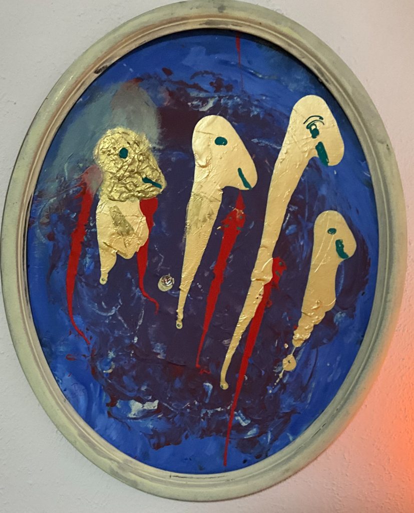 Dieses ovale Acrylbild zeigt vier Schafe, reduziert auf ihre wesentlichen Formen und eingebettet in eine dichte, dunkle Farbwelt. Der massive Holzrahmen umschließt das Motiv wie ein stilles Zeichen oder ein altes Emblem – weniger als Dekoration, mehr als Behältnis für Beobachtung.