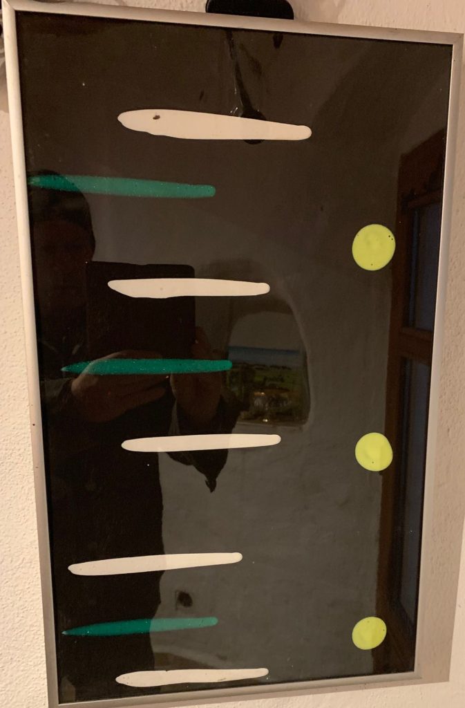 Dieses gerahmte Neon-Acrylwerk basiert auf Reduktion, Rhythmus und bewusster Zurückhaltung. Ein dunkler, nahezu absorbierender Bildgrund trägt eine begrenzte Anzahl wiederkehrender Elemente: kurze horizontale Balken in gebrochenem Weiß und kühlem Grün sowie drei kreisförmige Neonpunkte, vertikal am rechten Rand angeordnet. Nichts wirkt zufällig, jede Setzung behauptet ihre Notwendigkeit.