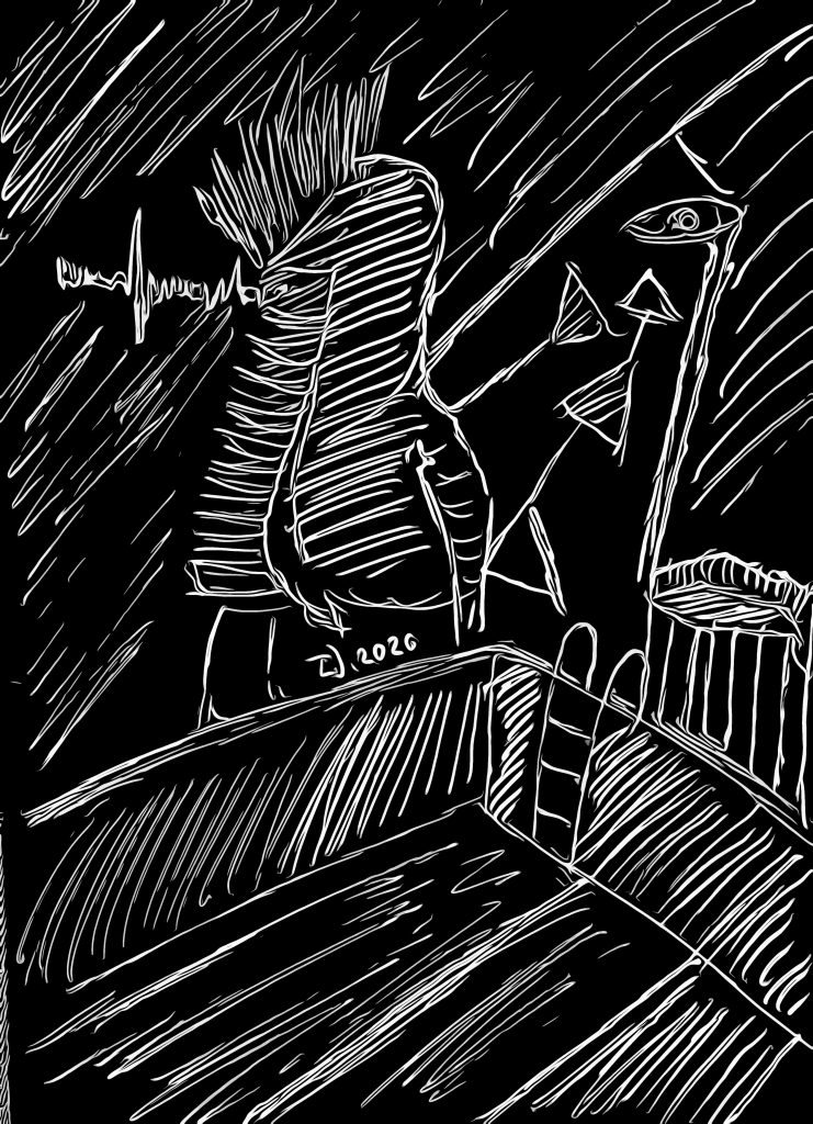 In Signal in the Shadow Chamber, Painter LTj ( 2026 ) draws white ink into black Tonpapier like a carved transmission—light behaving like a wound, or a rescue line. The central figure feels skeletal and segmented, built from vibrating stripes, half-body and half-signal. To the left, a waveform flickers: breath, sound, heartbeat—something that refuses to go silent.