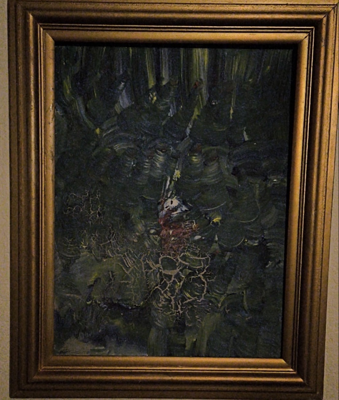 The golden frame creates a deliberate contrast. Inside the frame the painting is dark and mysterious, but the frame gives the work a quiet dignity, almost like a relic or a fragment of an old forest story.