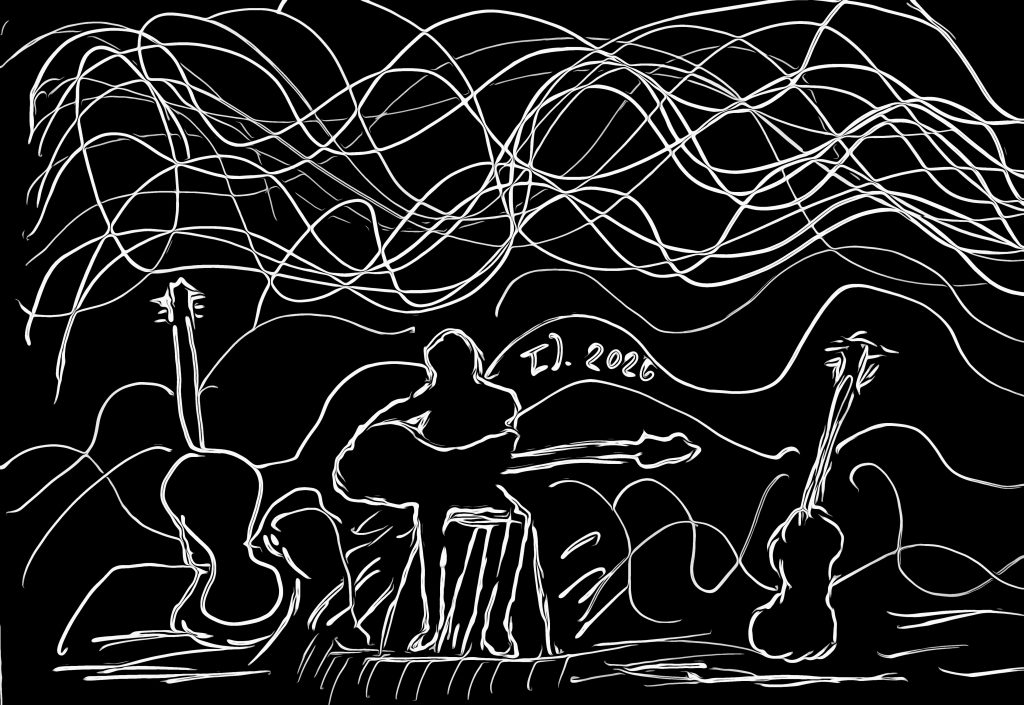 Above the musician the drawing begins to open. White lines spread across the black surface in waves and curves. When I drew them, I thought of sound moving through space. Every note that leaves a guitar doesn’t disappear—it travels, reflects, multiplies, and transforms. These lines are my way of visualizing that invisible movement.